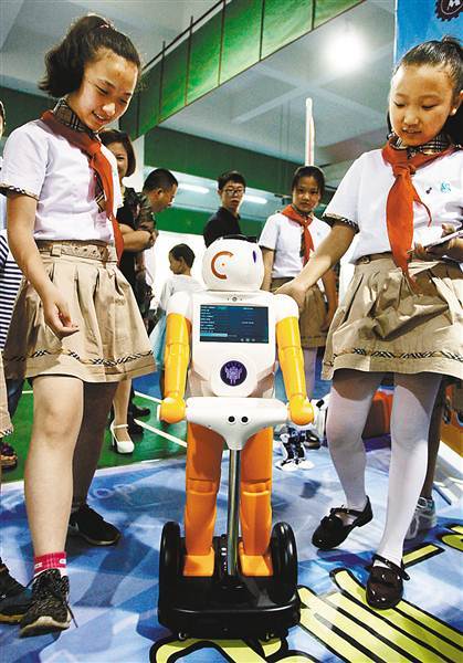5月21日,九龙坡区鹅公岩小学,重庆首届青少年创客嘉年华活动现场,会传菜的机器人吸引了不少师生的目光。特约摄影 苏思